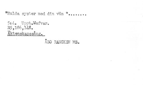 //// ''Hulda syster med din vän //// 5: A. Uppt .Wefvar. //// R5,186,148. //// M - : - //// Akt en sk ap s san p;. //// ÅBO HANCKHI MS. //// / ////