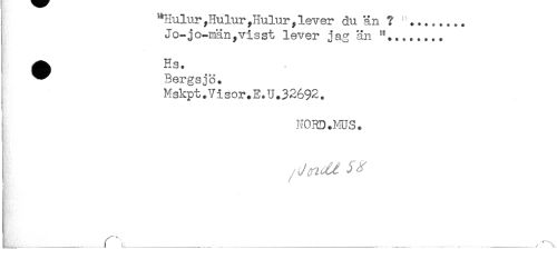 //// "Hulur,HuluryHulur,lever du än ? ........ //// Jo-jo-män^visst lever jag än "........ //// ^ Bergsjö. //// Mskpt.Visor.E.U.32692. //// i //// } NORD.MUS. //// ] ^ ^ / //// ^ - ___ _ ^. ////