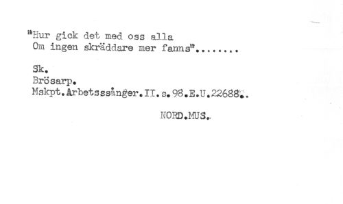 //// "Hur gick det med oss alla //// Om ingen skräddare mer fanns'*........ //// Sk. //// Brosarp. //// Mskpt.Arbets ssånger.II.s.98.E.U.22688^. //// NORD.MUS., ////