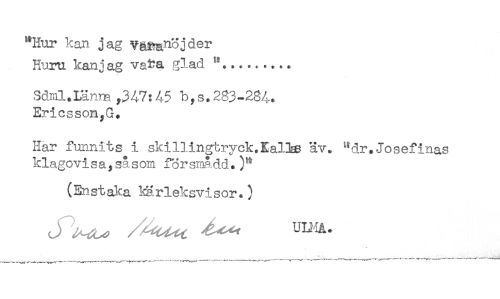 //// "Hur kan jag YåRa^öjder //// Huru kanj ag va^a glad //// Sdml.ninm ,347:45 b,s.283-284. //// Ericsson,G. //// Har funnits i skillingtryck.EaBss äv. "dr.Josefinas //// klagovisa,såsom försmådd.)" //// (Ensta!^a kärleksvisor.) //// t. ' , * //// , _ ^ _____---- ---* --- ' ////