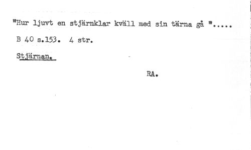 //// "Hur ljuvt en stjärnklar kväll med sin tärna gå "..... //// B 40 s.153. 4 str. //// Stjärnan. //// i //// RA. //// i //// i //// ] //// ' i //// < //// .. ////