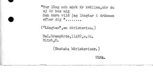 //// "Hur lång och mörk är kvällen,när du //// ej är hos mig //// Och huru vild jag längtar i drömmen //// ^ efter dig ....... //// ("TRngtan**,en kärleksvisa.) //// Dal* Grangärde,11482,a.24+ //// Blixt,0. //// (Enstaka kärleksvisor.) //// ULMå. ////