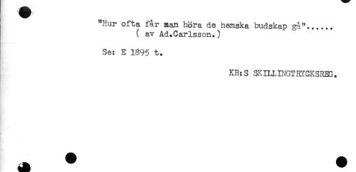 //// "Hur ofta får man höra de hemska budskap gå"...... //// ( av Ad.Carlsson.) //// Se: E 1895 t. //// KB:S SKILLINGTRYCKSRBG. //// t //// ^ ^jjjjj^ ////