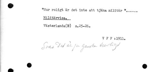 //// "Hur roligt är det inte att tjäna militär "...... //// . //// Hilitärvisa. //// Västerlanda(B) s.25-26. //// v F F :1911. ////