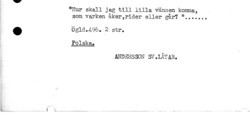 //// "Hur skall jag till lilla vännen komma, //// som varken åker,rider eller går? ..... //// Ögld.496. 2 str. //// Polska. //// i //// ANDERSSON SV. LÅT AR. //// - ////
