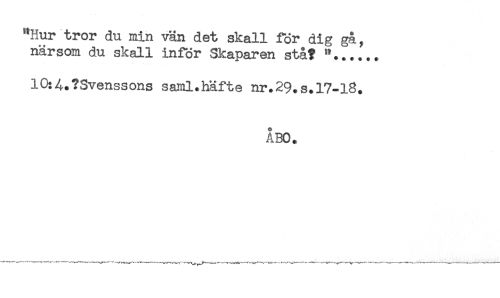 //// "Hur tror du min vän det skall för dig gå, //// närsom du skall inför Skaparen stå? //// 10:4.?Svenssons saml.häfte nr.29.s.17-18. //// ÅBO. ////
