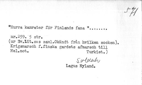 //// t //// t //// ) //// ^Hurra kamrater for Finlands fana //// - ) ** : //// nr.259. 5 str. //// (ur Sv.Lit.s:s saml.Ol^ndt från hvilken socken). //// Krigsmarsch f.finska gardets afmarsch till //// Mel.not. Turkiet.) //// Lagus Nyland. //// i //// t //// < //// i ////