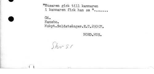 //// "Husaren gick till kammaren //// i kammaren fick han se //// ^^ Gä + //// ^^ Hanebo. //// Mskpt.Soldat sånger. E. U. 293 07. //// NORD.MUS. //// t_^_ fi_____. ////