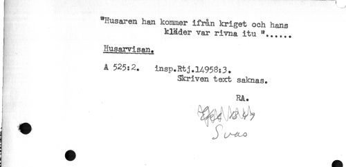 //// I "Husaren han kommer ifrån kriget och hans //// i kläder var rivna itu "...... //// ! Husarvisan. //// ) Å 525:2. iasp.Rtj.l4958:3* //// j Skriven text saknas. //// RA. //// j ^ J ////