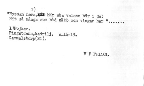 //// "Hyssan hera,g& här ska valsas här i dai //// hit sa mänga som båd näbb och vingar har "....... //// 1)Pojkar. //// Pingstdans,kadrilj. s.16-19. //// Gammalstorp(Bl). //// V F F:1AQ1. //// ' i //// < ////