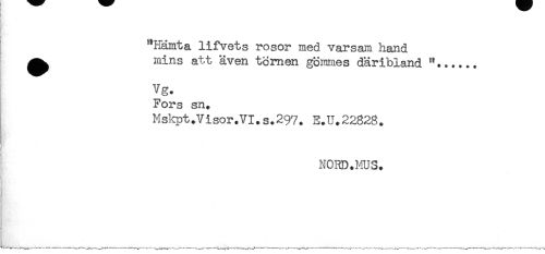 //// ; **Hämta lifvets rosor med varsam hand //// ^^ mins att även tornen gömmes däribland //// Vg. //// Fors sn. //// Mskpt.Visor.VI.s.297. E.U.22828. //// NORD.MUS. ////