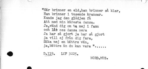 //// "Här brinner en eld,han brinner så klar, //// Han brinner i tusende kransar. //// ^ Kunde jag den glädjen få //// Att med min käresta dansa. //// Ja,vänd dig om ta mej i famn //// och låt oss dansa mera //// Ja har så gjort ja har så gjort //// ja vill ej från dig fara, //// Söka mej en bättre vän, //// ja,bättre än du kan vara //// ^ D.119. LUF 3225. ////