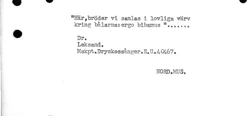 //// "Här,bröder vi samlas i lovliga värv //// kring bålarna: ergo bibemus //// ^ Dr. //// Leksand. //// Mskpt.Dryckes sånger.E.U.4 C^67. //// NORD.MUS. ////