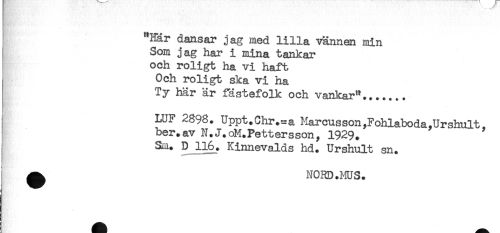 //// Här dansar jag med lilla vännen min //// Som jag har i mina tankar //// och roligt ha vi haft //// Och roligt ska vi ha //// Ty här är fästefolk och vankar"....... //// LUF 28%. Uppt.Chr.=a Marcusson,Fohlaboda,Urshult, //// ber.av N.J.oM.Pettersson, 1929. //// S^n. D 116. Kinnevalds hd. Urshult sn. //// j NORD .HUS. ////