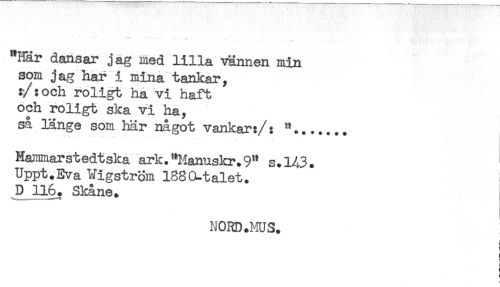 //// **Här dansar jag med lilla vännen min //// som jag har i mina tankar, //// :/:och roligt ha vi haft //// och roligt ska vi ha, //// så länge som här något vankar:/: "....... //// * //// Hammarstedtska ark."Manuskr.9" s.M3. //// Uppt.Eva Vigström 1880-talet. //// D 116. Skåne. //// i //// < //// } ////