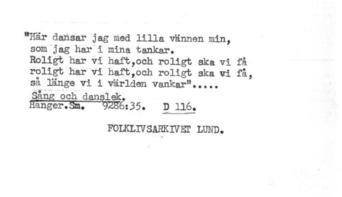 //// "Här dansar jag med lilla vännen min, //// som jag har i mina tankar. //// Roligt har vi haft,och roligt ska vi få //// roligt har vi haft,och roligt ska vi få, //// så länge vi i världen vankar"..... //// Sang och danslek. //// hänger.Sm. ^WS*6:35. D 116. //// FOLKLIVSARKIVEr LUND. ////