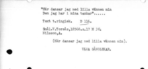 //// "Här dansar jag med lilla vännen min //// Den j ag har i mina tankar"...... //// Text t.ringlek. D 116. //// Smål.V.Torsåsyl8568.s.l7 H 30. //// Nilsson,A. //// (Här dansar jag med lilla vännen min). //// ^ ULMA SÅNGLEKAR. ////