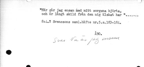 //// "Här går jag ensam med mitt sorgsna hjärta, //// och är långt skild från den mig älskat har ...... //// 6:4.? Svenssons saml.häfte nr.5.s.183-184. //// ÅBO. ////