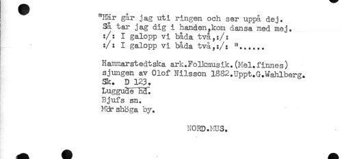 //// "Här går jag uti ringen och ser uppå dej. //// Så tar jag dig i handen,kom dansa med mej. //// :/: I galopp vi båda två,:/: //// :/: I galopp vi båda två,:/: //// Hammarstedtska ark.Folkmusik. (Mel. finnes) //// sjungen av Olof Nilsson l882.Uppt.G.Wahlberg. //// Sk. D 123. //// Luggu&e Ecfl, //// Bjufs sn. //// Mjrshoga by. //// NORD.MUS. ////