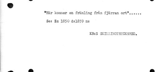 //// "Här kominer en främling från fjärran ort"...... //// Se: Zz 1850 d:l859 m: //// KB:S SKILIINGTRYCKSREG. ////