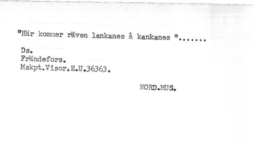 //// '...... .......... , //// "Här komner räven lankanes å kankanes //// Ds. //// Frändefors. //// Mskpt.Visor.E.U.36363. //// NORD.MJS. ////