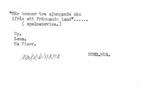 //// "Här kominer tre sjungande män //// ifrån ett främmande land"...... //// ( spelmansvisa.) //// Up. //// Lena. //// Ha Visor. ////