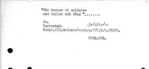 //// "Här koimner vi soldater //// med buller och bång //// Herrestad. Jl^J^^ //// Mskpt.III.Soldatsånger.s.7Cr7.E.U.28l82^ //// NORD.MUS. //// t //// - ////