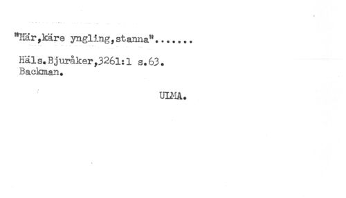 //// "Har,käre yngling, stanna"....... //// *..... Si. ..........J - - . i - . //// Häls.Bjuråker,3261:1 s.63. //// Backman. //// ULI-IA. //// < ////