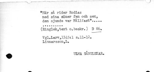 //// "Här så rider Rodias //// med sina söner fem och sex, //// den sjunde var Hå llfast'*..... //// (Ringlek,text o.beskr.) D 86. //// Vgl.Larv,3345:1 s.11-12. //// Linnarsson,L. //// ^ UH^IA .3ÅIJGLEKAR. ////