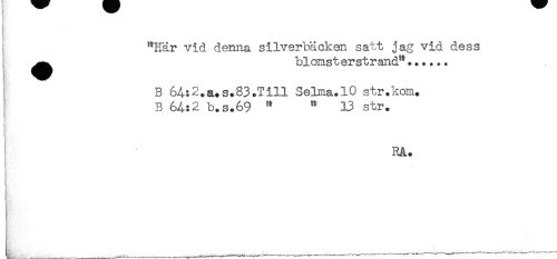 //// "Här vid denna silverbäcken satt jag vid dess //// ^^^ blomst erstr and"...... //// B 64:2.a.s.83.Till Selma.10 str.kom. //// B 64:2 b.s.69 " "33 str. //// i //// s //// RA. //// ! ////