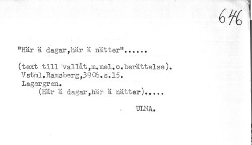 //// : //// "Här ä dagar,här ä nätter'^...... //// (text till vallat ,m.mel.o.berättelse). //// V stml.Ramsberg,3 9 C6. s. 15. //// Lagergren. //// (Här ä dagar,här ä nätter)..... //// ULMÅ. ////