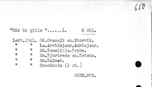 //// "Här är gille "......1. D 261. //// , .. ' '.t f i ....t //// Lelrb.1941. Gä.Ovansjö sn.Storvik. //// " " La. Arvid sjaur.Auj^tsjaur. //// " " Sk.Tomelilla.Tryde. //// " " Sm.Hjortreds sn.Totebo. //// " " Sm.KaLnar. ^ //// R " StockhoLn (3 st.) # //// NORD.MUS. ! //// i ////