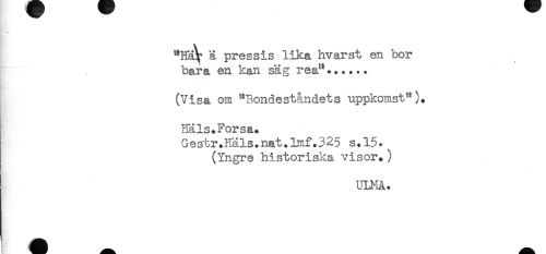 //// \ //// "Hä\* ä pressis lika hvarst en bor //// bara en kan säg rea"...... //// i //// ! . //// (Visa om "Bondeståndets uppkomst"^. //// Häls.Forsa. //// Gestr.Häls.nat.lmf.325 s.l$. //// (Yngre historiska visor.) //// Ul^iÅ. ////