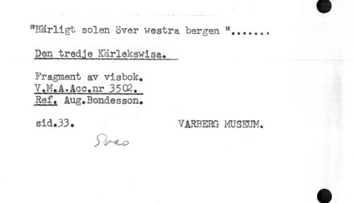 //// ' v - - . . ... . .. ..;.:............... //// "Härligt solen över westra bergen //// Den tredje Kärlekswisa. //// * - - . .i. . t //// Fragment av visbok. //// V.M.A.Acc.nr 3502. //// Ref. Aug.Bondesson. //// sid.33. VARBERG HUSEUM. ////