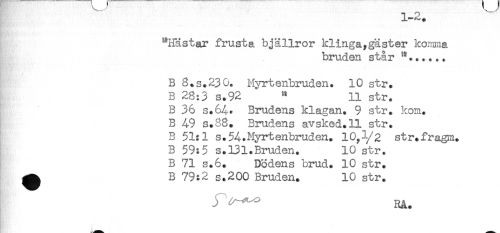 //// 1 -P //// ^Hästar frusta bjällror klinga,gäster komma, //// bruden står ^...... //// B 8.S.230. Hyrtenbruden. 10 str. //// B 28:3 s.92 * 11 str. //// B 36 s.64. Brudens klagan. 9 str. kom. //// B 49 s.88. Brudens avsked.11 str. //// B 51:1 s.54.Myrtenbruden. 10,3/2 str.fragm. //// B 59:5 s.131.Bruden. 10 str. //// B 71 s.6. Dödens brud. 10 str. //// ^ B 79:2 s.200 Bruden. 10 str. //// Rå. ////