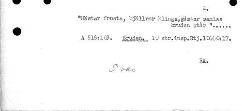 //// 2. //// "Hästar frusta, bjällror klinga,gäster samlas //// ^ bruden står //// A 516:103. Bruden. 10 str.insp.Rtj.10660:17. //// * //// ! ^ RA. ////