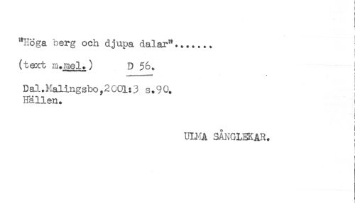 //// "Höga berg och djupa dalar"....... //// (text m.Hiel.) D $6. //// D al. Maling sbo, 2 001:3 s. 9 0. //// Hällen. i //// < //// t //// UD-fA SÅNGLEKAR. ! //// t ////