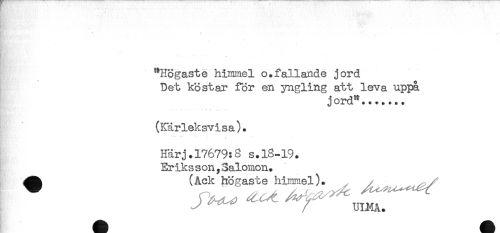 //// "HÖgaste himmel o.fallande jord //// Det kostar för en yngling att leva uppa //// jord**....... //// (Kärleksvisa). //// b //// Härj.17679:8 s.18-19. //// Eriksson,Salomon. //// ^^ (Ack högaste himmel). / ////