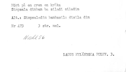 //// Högt pa en gren en kraka //// Simpsala dimbam ba siladi siladim //// Alt.: Simpsaladim bambasiln disila dim //// Nr 473 3 str. mel. //// LAGU5 ÅLÄNDSK A FCLIC7. 3. ////