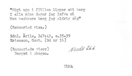 //// "Högt upp i f jällen ligger ett berg //// I alla mina dagar jag lefva ma //// Men vackrare berg jag aldrig såg" //// (Ramsartad visa.) //// Sdml. Årila, 347:43, s.35-39 //// Ericsson, Gust. (Bd nr 16) //// (Ramsartade visor) ^^ //// Berget i skogen. //// umå ////