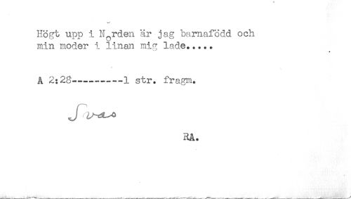 //// Högt upp i Norden är jag barnafödd och //// min moder i linan mig lade..... //// * //// A 2:28----1 str. fragm. //// RA. ////