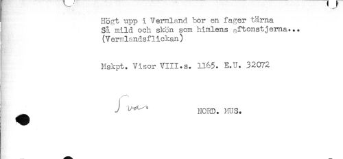 //// Högt upp i Vermland bor en fager tärna //// Så mild och skön som himlens aftonstjema... //// (Vermlandsf lickan ) //// Mskpt. Visor VIII.s. 1165. E.U. 32072 ////