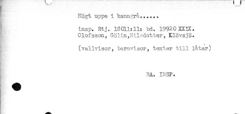 //// Högt uppe i kanngrå...... //// -H //// insp. Rtj. 18011:11: bd. 19920 XXIX. //// ! Olofssony GöliiiyNilsdottery Elövsjö. //// . //// ' (vallvisor^ barnvisory texter till låtar) //// ! RA. INSP. ////
