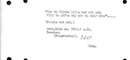 //// "Hör du flicka lilla med ett ord. //// Vill du gifta dej när du blir stor"..... //// (Polska med mel.) //// Sdml.Lids sn. 7922:3 s.16. //// Dencker. //// (Po Iskt ext er). ^ .y //// ULHå. ////
