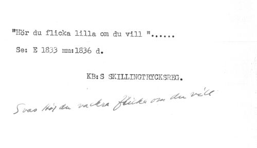 //// "Hör du flicka lilla om du vill "...... //// Se: E 1833 mm:1836 d. //// ! //// * //// KB:S SKILLINGTHYCKSREG. ////