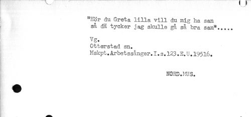//// "Hör du Greta lilla vill du mig ha san //// så dä tycker jag skulle gå så bra san"..... //// vg. //// Otterstad sn. //// Mskpt.Arbet ssånger.I.s.123.E.U.19516. //// NORD.MUS. ////