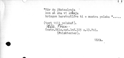 //// "Hör du jänteslynja " //// kom så ska vi svanja //// kringom harstugålfve ti e muntra polska //// (text till polska?). //// Gestr.Häls.nat.lmf.325 S.23.Fol. //// (Polsktexter). //// UU-IA. ////