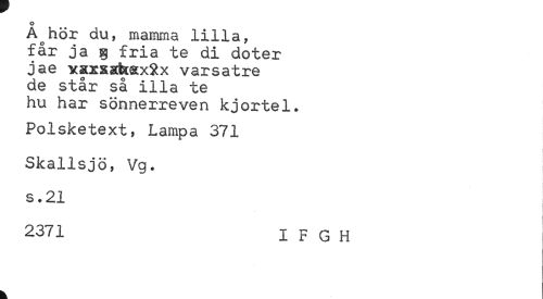 //// o //// A hör du, mamma lilla, //// får ja g fria te di doter //// jae YKxxadkaxRx varsatre //// de står så illa te //// hu har sönnerreven kjortel. //// Polsketext, Lampa 371 //// Skallsjö, Vg. //// s.21 //// i //// 2371 I F G H ////