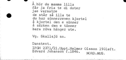 //// A hor du mamma lilla //// får ja fria te di doter //// jae varsatre //// ^ de står så illa te //// du har sönnerreven kjortel //// å kjortel den e sönner //// å särken den e tönner //// bara röva hänger ute. //// Vg. Skallsjö sn. //// Danstext. //// IFGH 2371/21.Uppt.Helmer Olsson 1931eft. //// Edvard Johanson f.1846. MQRD.MUS. //// å t ////