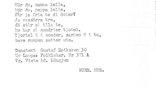//// no i* uu., iiniim.nj, jn=?j-j-ta, //// hör du, pappa lelle, //// får ja fria te di doter? i //// Ja vassärra tre, //// dä står sa illa te? //// ho har så sondrier tjotel. //// Tjortel ä i sönder, särken ä i tu, //// bare rumpen setter ute. //// Danstext Gustaf Eriksson 30 //// Ur Lampa: Folklekar. Nr 371 å //// Vg. Viste hd. Längjixn //// NC3D. MUS. ////
